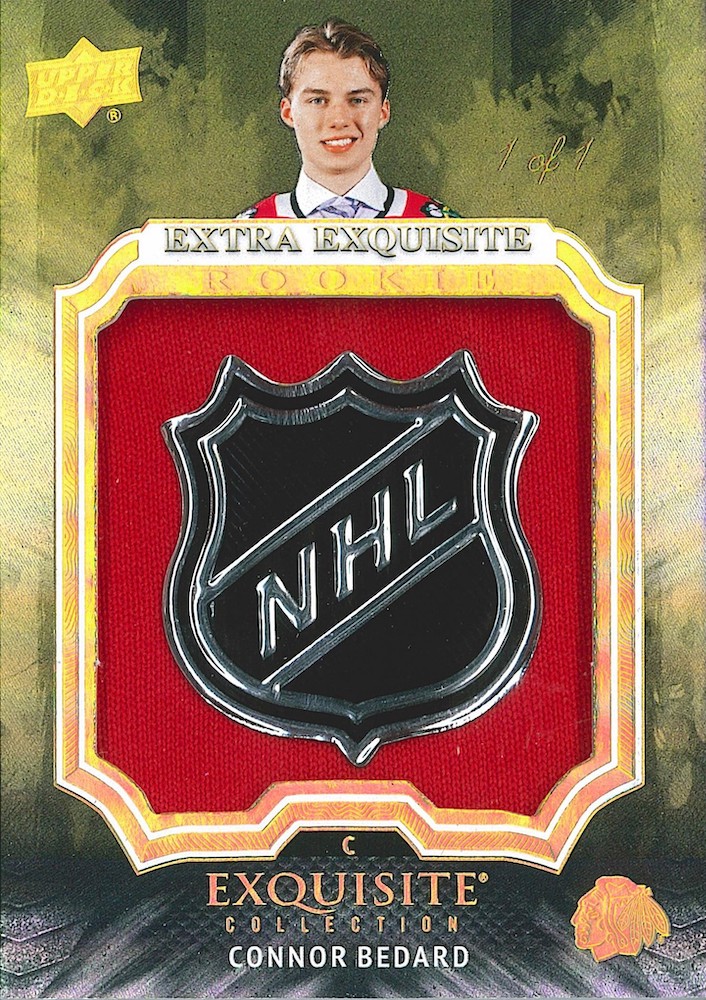With at least one card expected per box, 2023-24 Upper Deck Black Diamond Hockey finishes with 2023-24 Upper Deck Exquisite Collection Hockey. The high-end Exquisite Collection NHL brand carries on as an insert within other UD products.