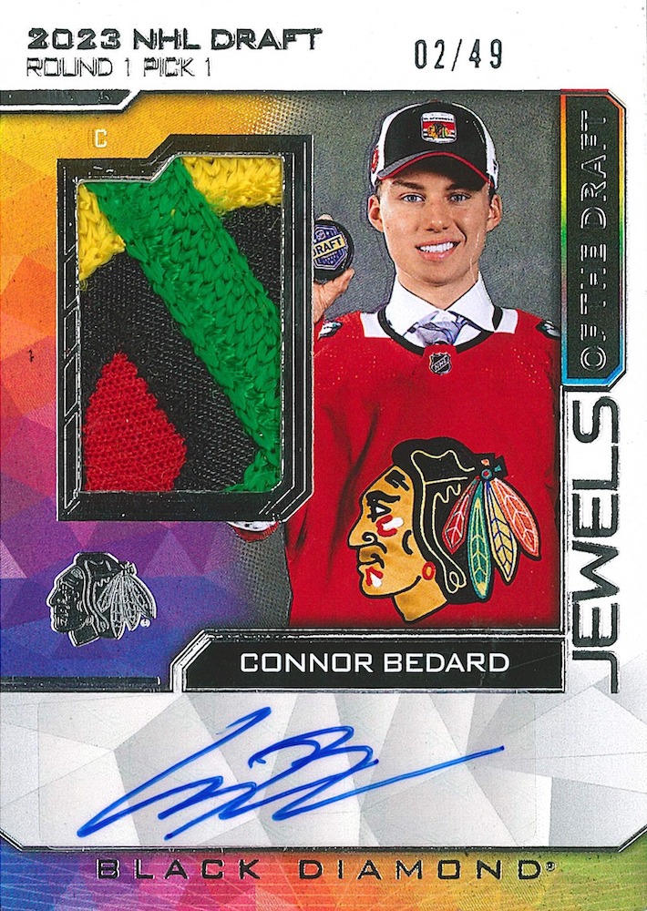 The remaining hits take various forms in 2023-24 Upper Deck Black Diamond Hockey. The Jewels of the Draft (#'d) autograph patch cards cover top rookies and veterans.