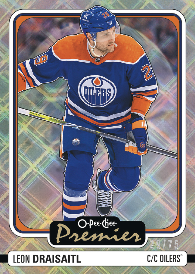 Showcasing a retro style, O-Pee-Chee Premier (1:6 packs) adds new Diamond Rainbow Foilboard parallels, numbered to 75 copies. These rare parallels are only in Hobby boxes.