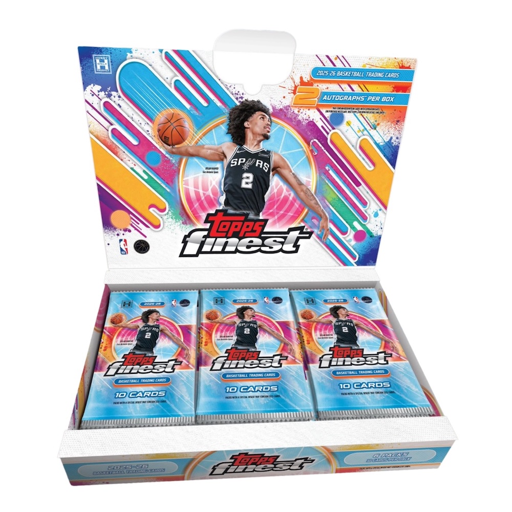 Marking the first fully-licensed Finest NBA set since 2007-08 Topps Finest Basketball, Spurs rookie Dylan Harper adorns the box for 2025-26 Topps Finest Basketball.