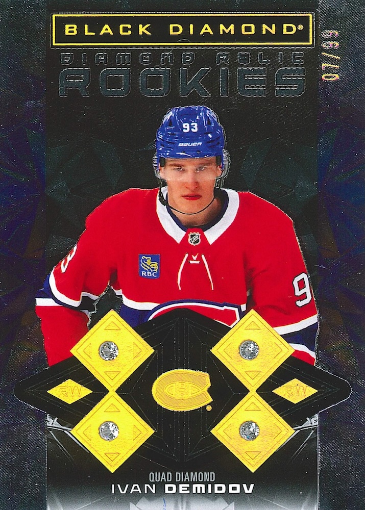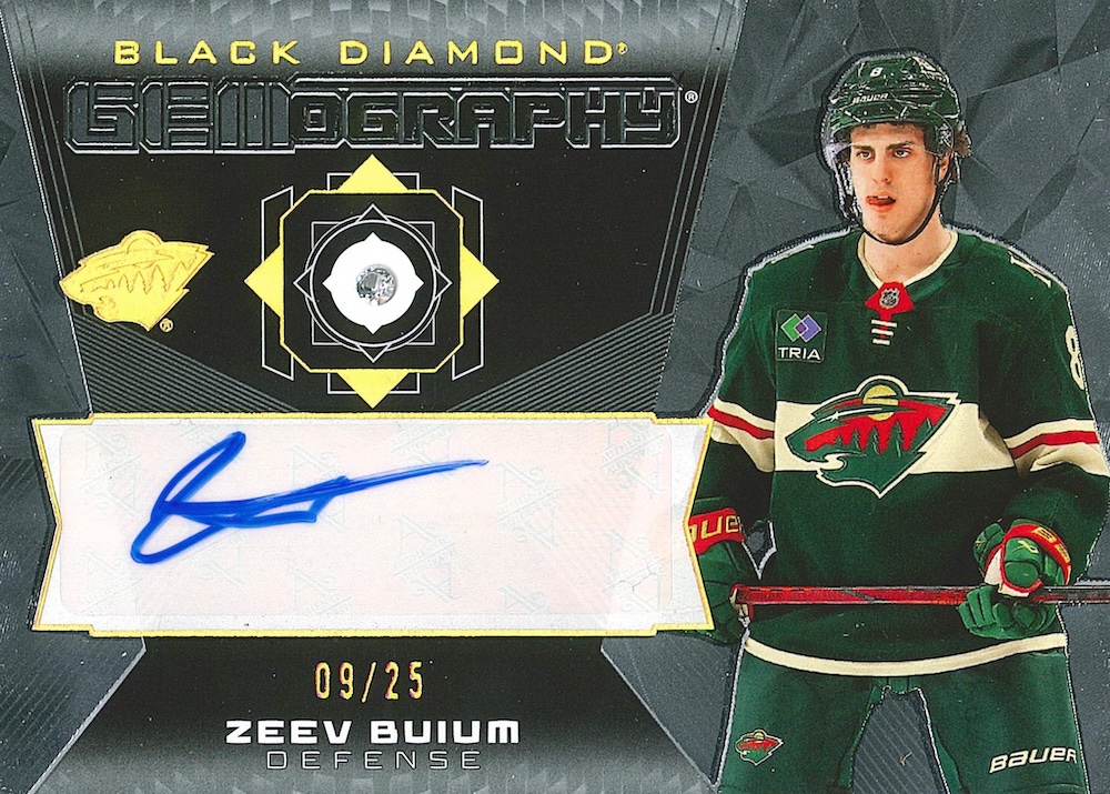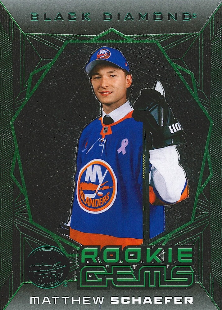 Covering 95 veterans, legends and rookies, the base set for 2025-26 Upper Deck Black Diamond Hockey is numbered to 349 copies. The full set has Green (/10) and Gold (1/1) parallels.