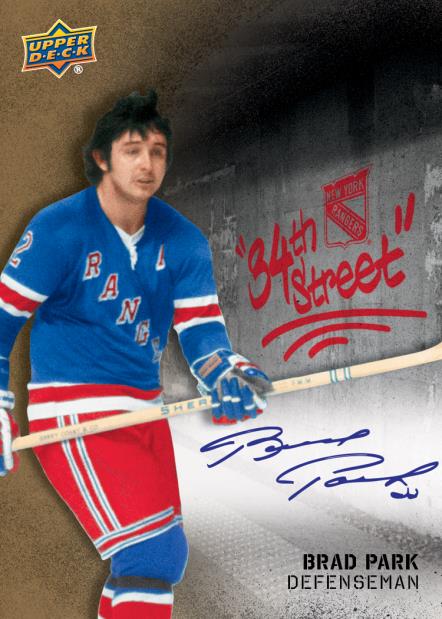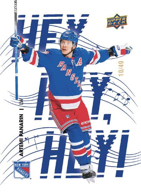 Themed inserts include 34th Street (1:3 packs), featuring fan favorites, Broadway Bruisers (1:7 packs), dedicated to the enforcers, and Hey, Hey, Hey! (1:3 packs), which captures a goal celebration.
