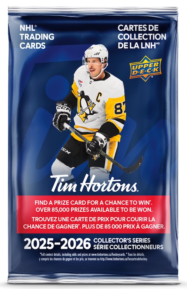 An annual tradition for coffee and NHL aficionados, 2025-26 Upper Deck Tim Hortons Hockey marks the 11th straight year of the very popular Canadian release. Sidney Crosby remains the face of the promotion.