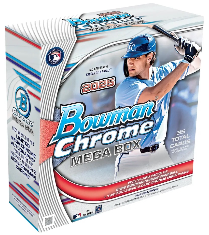 Each box yields two exclusive Mega Chrome packs along with five packs of 2025 Bowman Chrome Baseball.