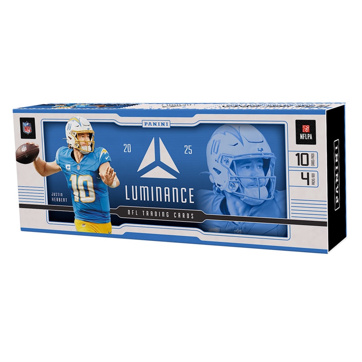 An early-season release for NFL fans, 2025 Panini Luminance Football continues to showcase action images with large text.