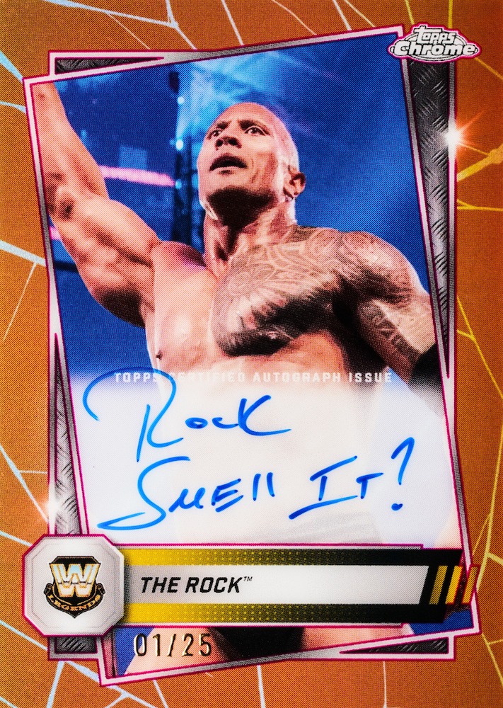 The 2025 Topps Chrome WWE Wrestling checklist makes a big splash with the first licensed WWE autographs of The Rock (Dwayne Johnson) since 1998. Some cards even have an inscription.