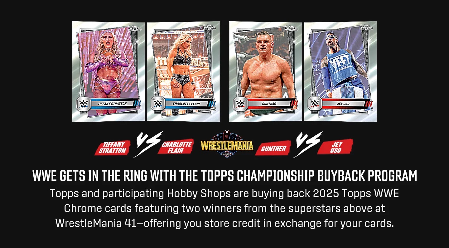 Another part of the 2025 Topps Chrome WWE Wrestling product is the Topps WWE Championship Buyback. For two specific base subjects (and parallels) in the set, collectors can redeem the cards for credit at their participating shop.