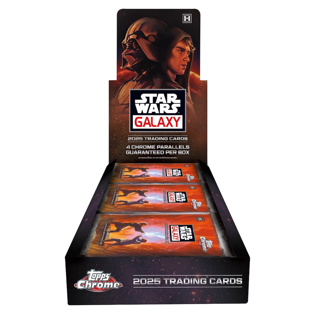 Again bringing chromium stock to the quality illustrations, the 2025 Topps Star Wars Galaxy Chrome checklist highlights key characters and moments with an assist from top artists. The actors behind the characters also lend their signatures to the product.