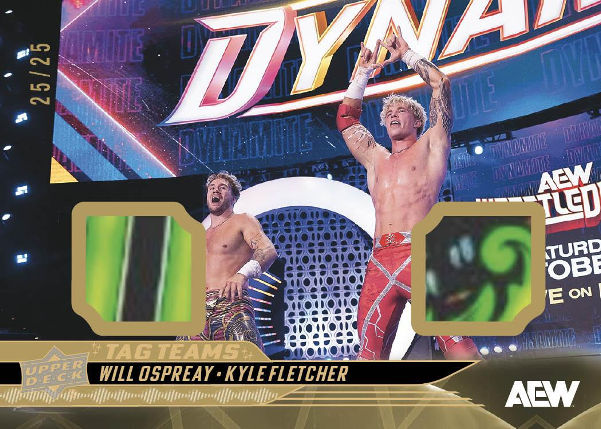 Look for relics via Base Wrestlers Red Memorabilia (1:57 packs), Base First UD Red Memorabilia (1:342 packs) and Base Tag Teams/Trios Red Memorabilia (1:171 packs). The Gold parallels are limited to 25 copies. There are also exclusive Base Red Mat versions in Blasters.