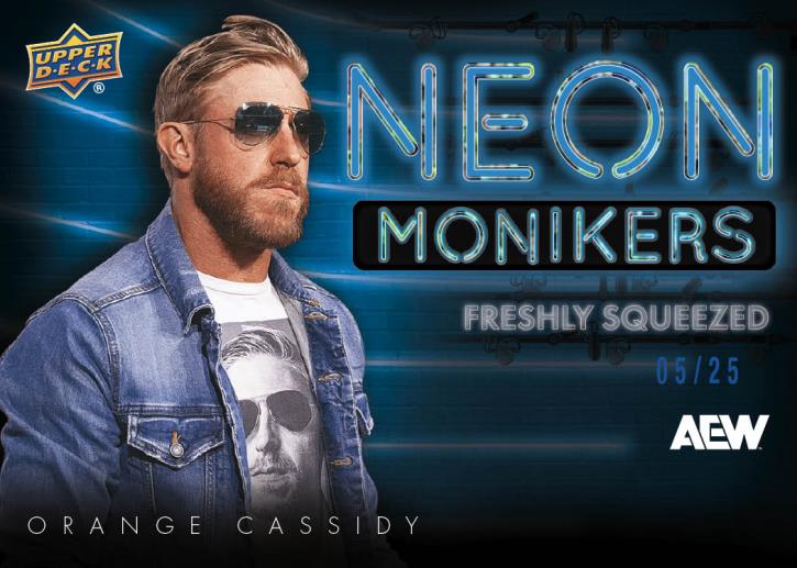 Inserts provide more choices in 2025 Upper Deck AEW Wrestling. Debuts include Neon Monikers (1:7 packs), a colorful series centered on nicknames.